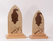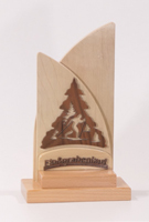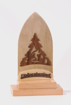 | Pokal rechts: Sockel Buche dunkel, Trägerplakette Weißbuche, Figur Buche |