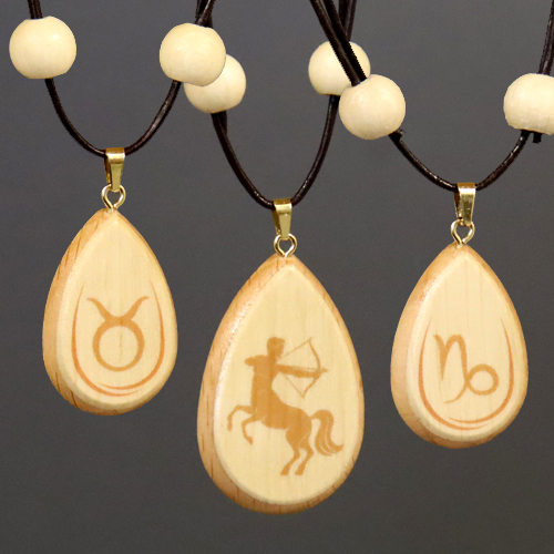 Schmuckanhänger aus Holz aus verschiedenen Formen mit Sternzeichen bedruckt